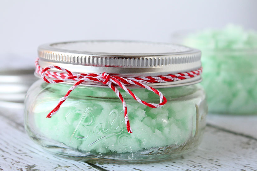 To make this festive variation of a sugar scrub, mix one cup of sugar, one-third of a cup of baby oil, two tablespoons of corn syrup, one-half of a teaspoon of peppermint extract, and one drop of green food coloring together. Put the mixture in a half pint jar and tie a ribbon around the lid. This scrub is gentle enough to use on faces, but the receiver should first test it on their hand or arm.