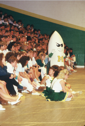 Now an iconic image of the McNicholas community, Rocket Man wasn’t a fixture at the school until 2005, when members of Spirit Club felt that a costumed mascot would help engage the student section during sporting events, pep rallies, and other community events. Having made this new decision about a costume, Michelle Herbert, Class of ’07, purchased the materials for $800, and, with the help of her family, built the first costume for Rocket Man.