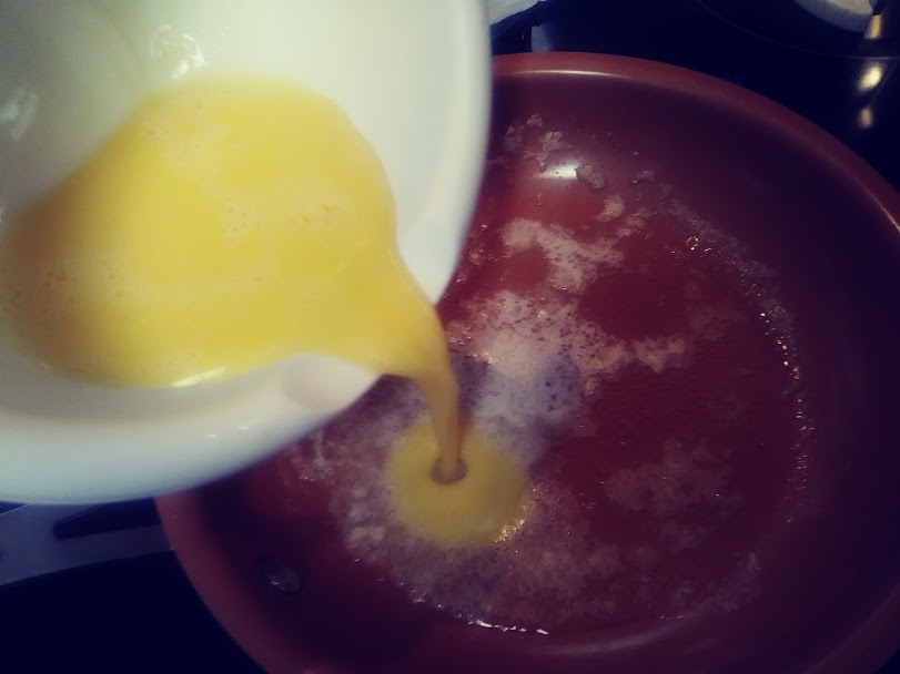 When the butter in the pan is hot enough that it makes drops of water hiss, add eggs.