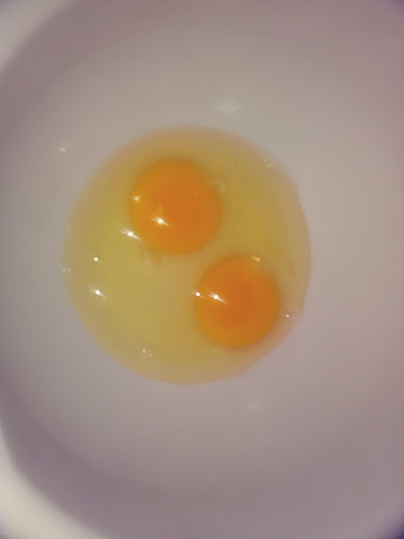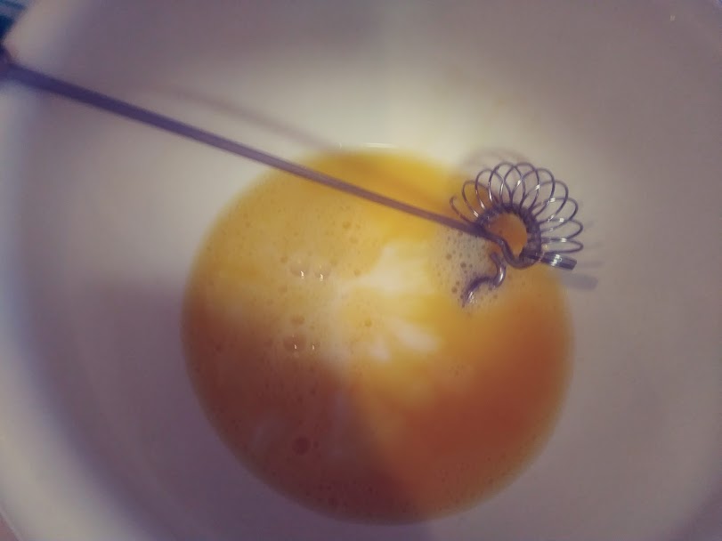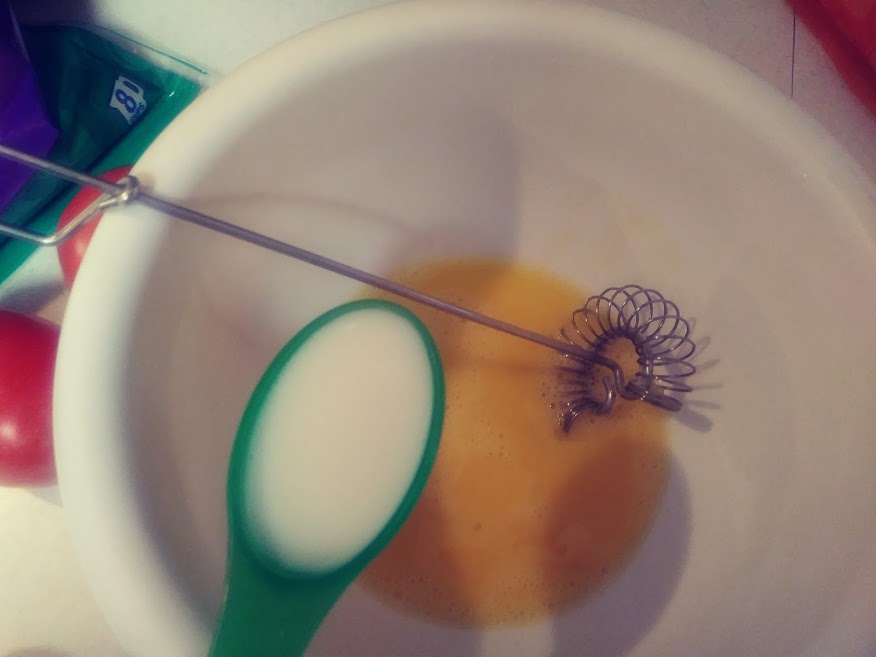 The recipe calls for two eggs, two tablespoons of whole milk, two tablespoons of butter, salt and ground white pepper (which was left out of this omelet), and a filling of choice. The recipe also calls for a mixing bowl, a whisk, a pan (between six to ten inches wide), a spatula, and a tablespoon measuring cup.