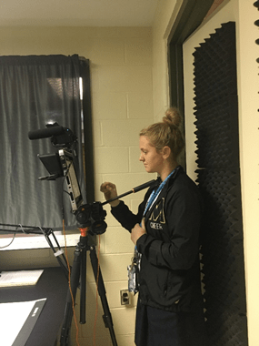 Junior Madeline Daley helps out behind the camera for morning online announcements. “Some people don’t want to be in front of the camera, so they can help out behind,” Wehrman said.
