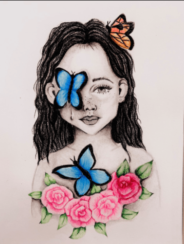 Senior Marian Favro used colored pencils and charcoal pencil for this drawing. “I wanted to show that on the outside we can show the opposite [of] how we are feeling. I also added butterflies and flowers to add color and beauty to the piece,” Favro said.