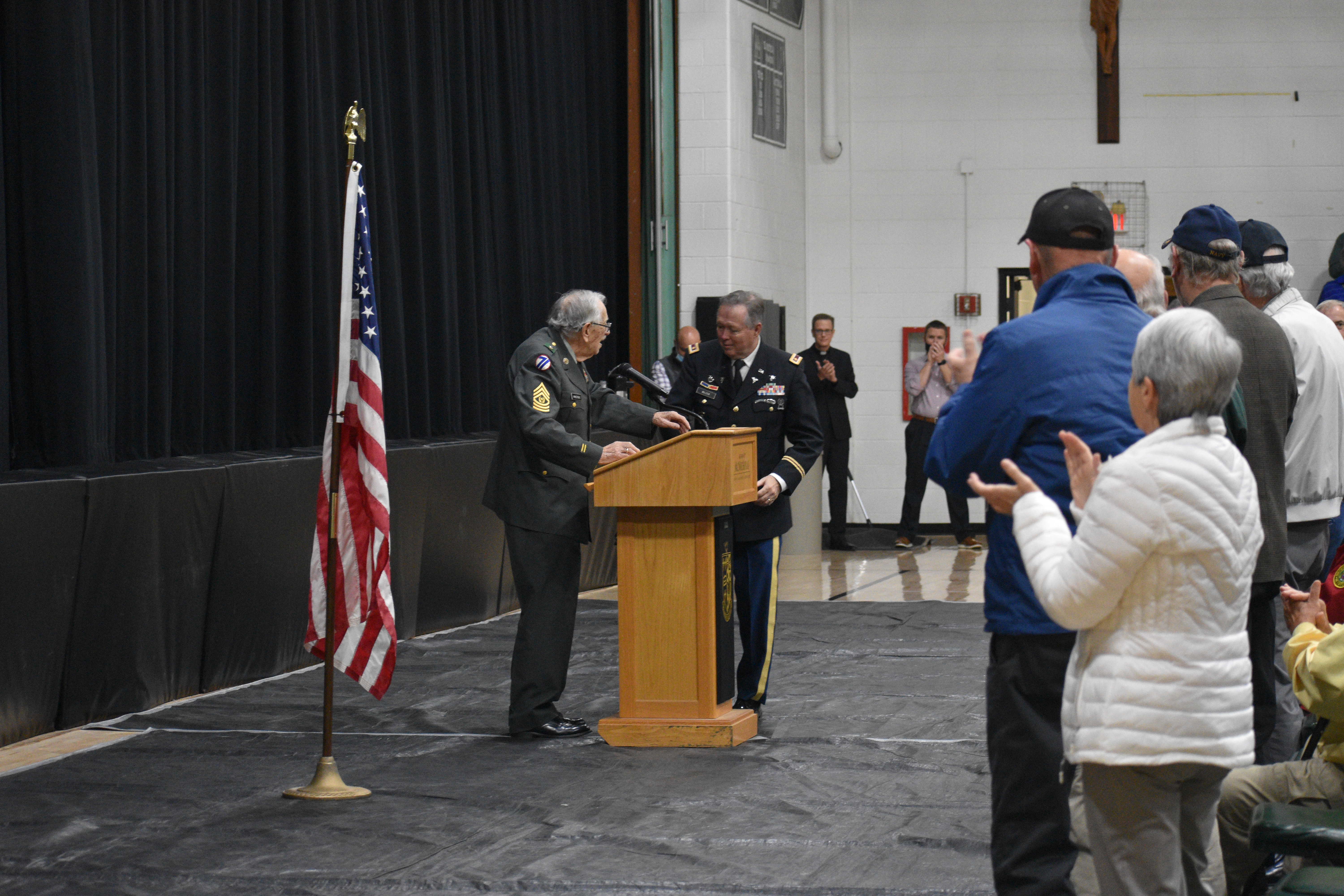 McNicholas once again welcomed many veterans during its annual Veterans Day Assembly on Thursday, Nov. 11. This year’s guests included alumni as well as those who traveled with former McNicholas students and the Gary Sinise Foundation in April 2019 to visit the National World War II Museum in New Orleans. Veterans were again able come into the school, unlike in 2020, when students had to watch a pre-recorded video of interviews with veterans due to Covid-19 protocols.