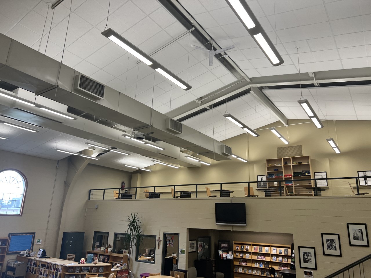 The space up the stairs in the library is where many students go to study or read some of their favorite books.