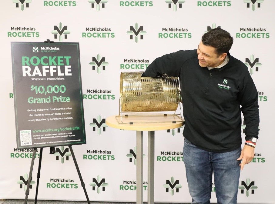 The Rocket Raffle is a student-driven fundraiser, so students were in charge of selling tickets. Students were challenged to take initiative and sell tickets for the cause of giving future Rockets the opportunity to come to McNicholas. Students are encouraged to sell tickets anyway they’d like, such as sending texts or videos about the raffle to their friends and family.