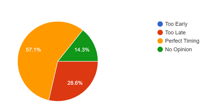 The majority of students thought that Spring Break was perfectly timed this year despite it falling later than surrounding high schools. Students like the idea of a break in the fourth quarter before stress begins to build up in preparing for final exams.