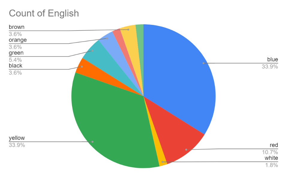 English had a wide variety of colors but blue and yellow both tied for with exactly 33.9%. Freshman Maryn Minnich states, “Blue, it is a calm color and reminds me of reading.” Freshman Kiera Norton states, “Yellow, because of pencils.”