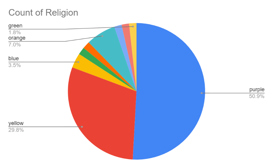 Although not all schools offer religion classes, McNicholas does, and religion had one of the highest numbers of consistent votes for the same color. Purple came in first with over 50%. Freshmen Lincoln Conrady states, “Religion is purple because the advent candles represent the weeks of Christmas.”