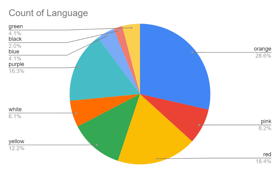 Last comes language classes like Spanish and French. Orange received the most votes with 28%. Next was red with 18%. Sophomore Megan Berger states, “Orange, orange makes me think of traveling.” Spanish teacher, Mrs. Tracy Canisalez states, “When I think of the Spanish language, I think of the color red (and yellow), because it’s the color of the Spanish flag.”