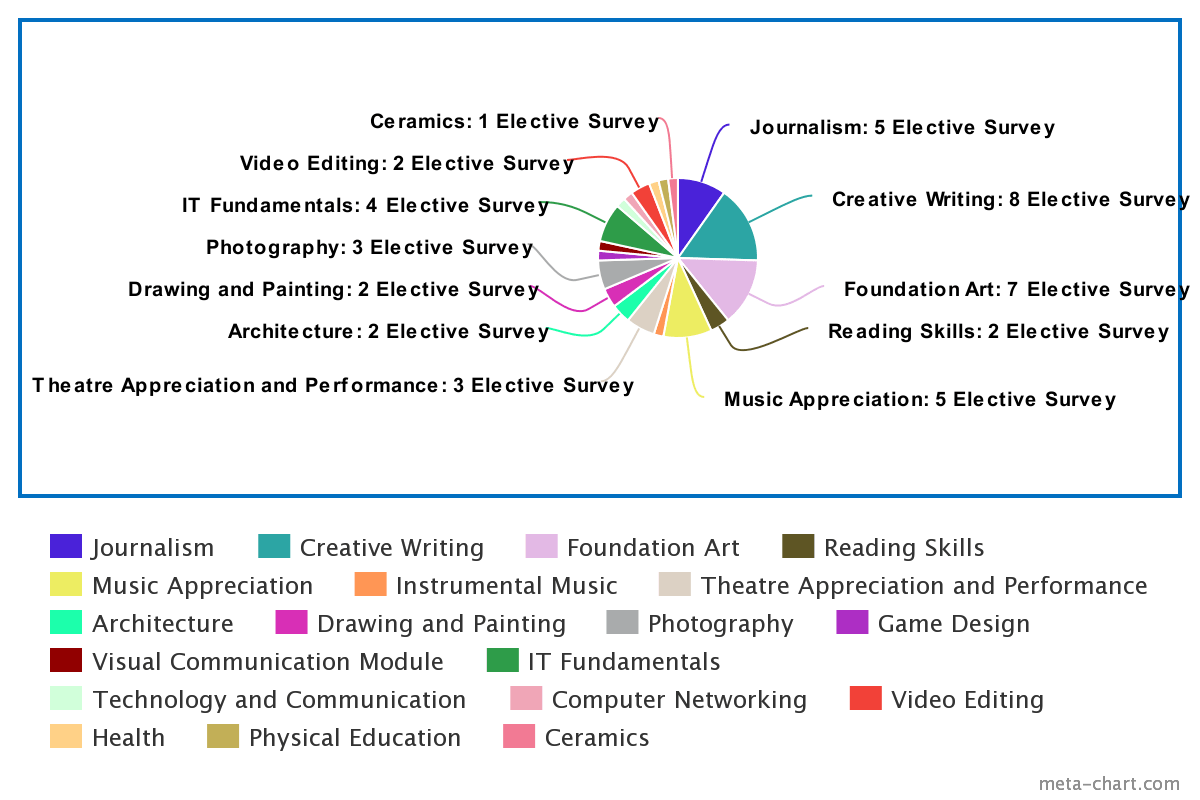 Overall, the chart shows that the student body is drawn to a variety of discipline areas that reflects the variety of brilliances within the student population. This survey’s results show that Creative Writing is the most popular elective, with Foundation Art one student behind.