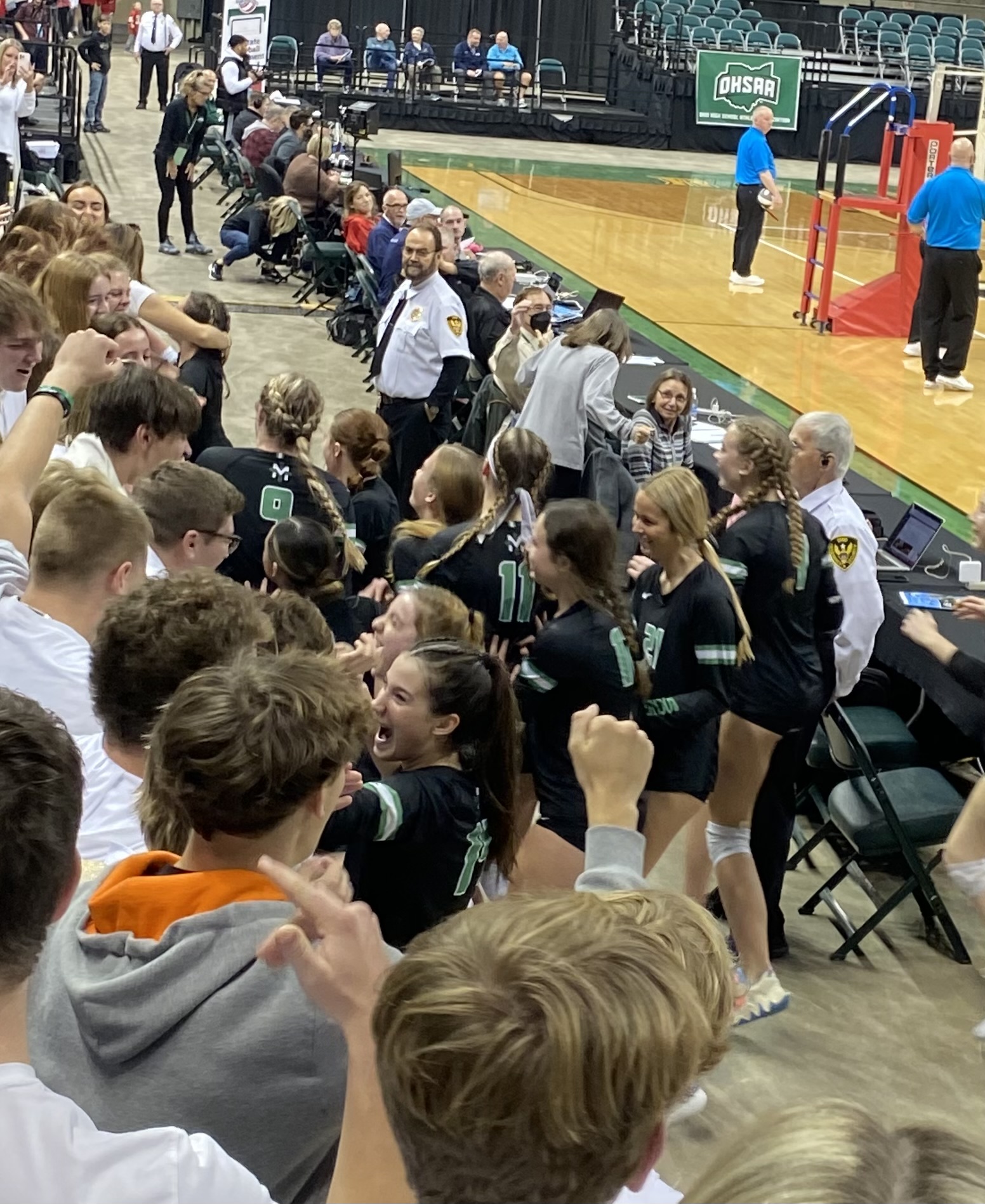 Women’s Volleyball was the only fall sport this year who was able to keep the streak alive of making it to the state tournament, where they ended their season as state runner up losing in three sets to Division III state champion Lake Catholic: 25-17, 25-22, and 25-13. The 2023 Women’s Volleyball Team is the first women’s volleyball team in McNick’s history to make it to the state final four. With the privilege of making it to the state tournament comes the nerves of continuing their wins. Playing at the Nutter Center at Wright State University sparked nerves within the team as playing in a large arena was a new experience for them. Head Coach Darlene Tierney made sure they were comfortable.