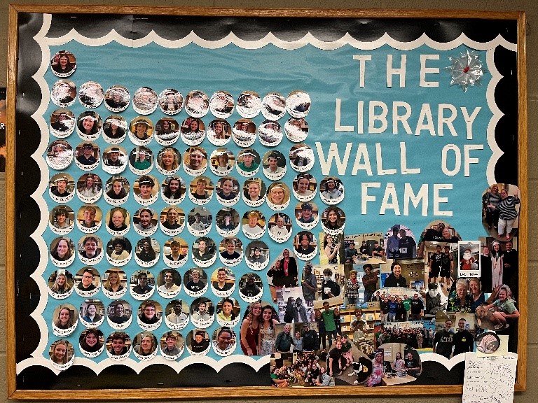 The Library Wall of Fame is a bulletin board in Almer’s office with pictures of both current and former office aids.