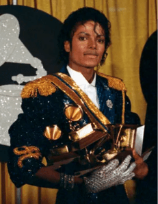 Photo of Michael Jackson holding his eight Grammys at the Grammy Awards Ceremony in 1984 from Encyclopedia Britannica.